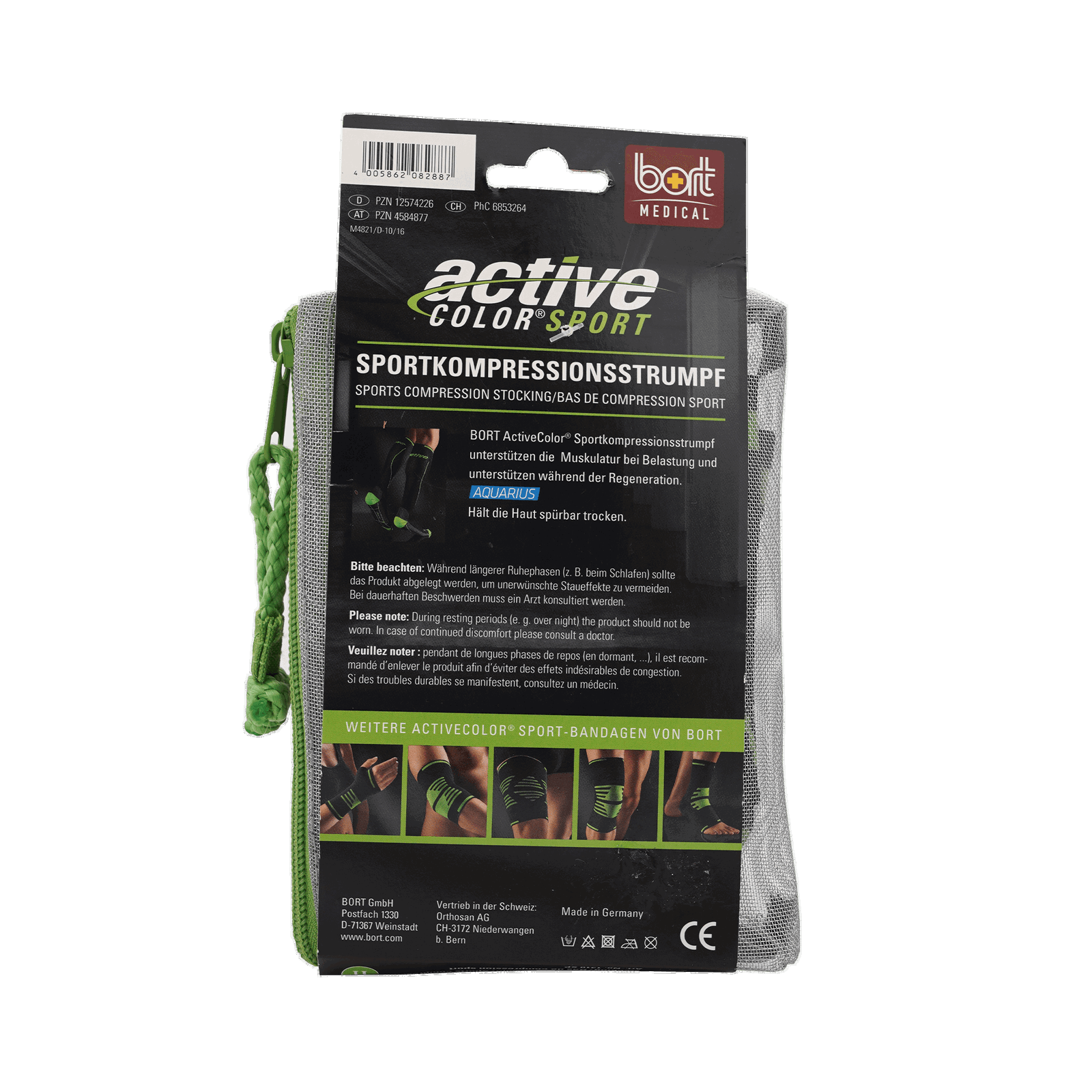 Der ActiveColor Kompressionsstrumpf von Bort aus offenporigen Mesh-Gestrick ist aufgrund seines guten Klimamanagements und des gleichbleibenden Kompressionsdrucks ideal zur Nutzung bei sportlicher Aktivität geeignet. Das Material besteht aus feuchtigkeitsregulierender Komfortfaser. Die anatomische Passform gewährleistet einen perfekten Sitz für alle Fuß- und Wadengrößen bis circa 33 cm. Der Strumpf ist in einem modischen Design in den Farben Schwarz/Grün designet.