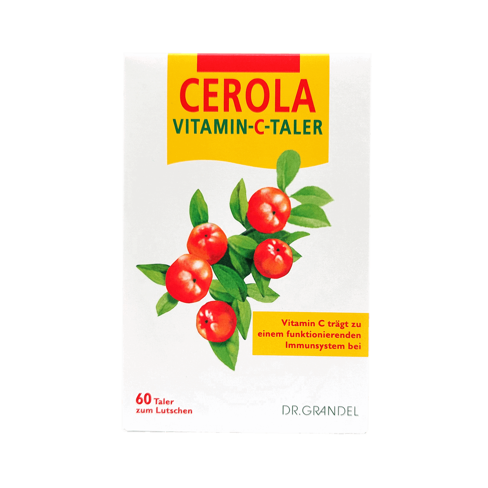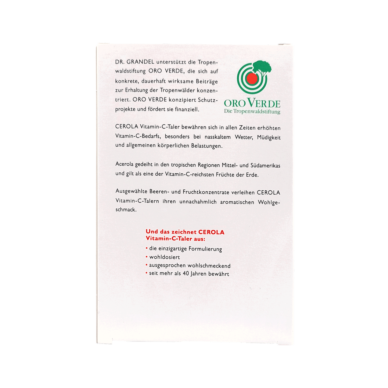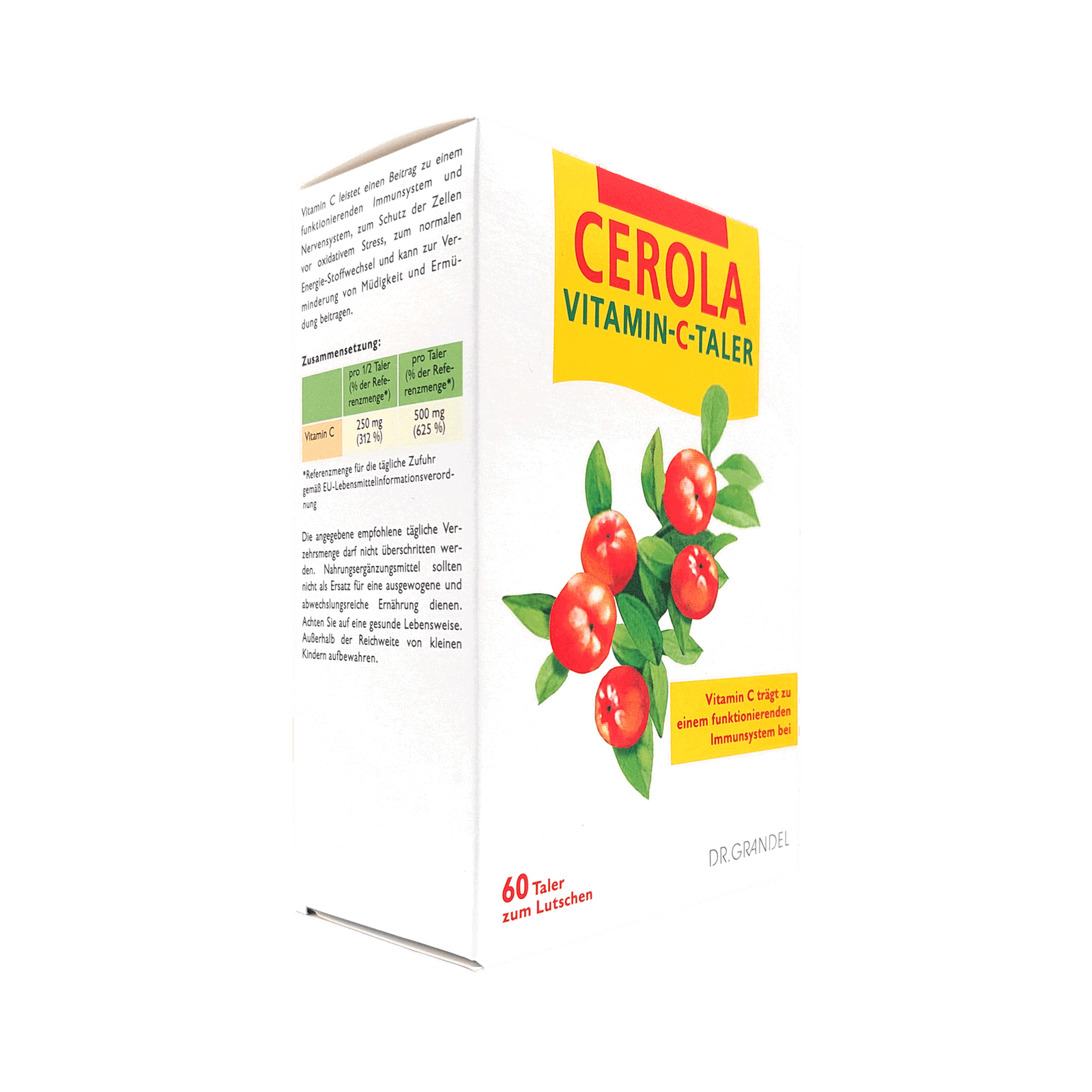 CEROLA Vitamin C Taler GrandelNach dem Rezept der Natur. Vitamin C trägt zu einem funktionierenden Immunsystem bei. Acerola gedeiht in den tropischen Regionen Mittel- und Südamerikas und gilt als eine der Vitamin-C-reichsten Früchte der Erde Acerola-Fruchtpulver sowie ausgewählte Beeren- und Frucht-Extrakte verleihen CEROLA Vitamin-C-Talern ihren unnachahmlich aromatischen Wohlgeschmack. CEROLA Vitamin-C Taler enthalten Vitamin C im ganzheitlichen Verbund mit den natürlichen Begleitstoffen. CEROLA Vitamin-C-Taler bewähren sich in allen Zeiten erhöhten Vitamin-C-Bedarfs, besonders bei nasskaltem Wetter, Müdigkeit, Stress und allgemeinen körperlichen Belastungen. Vitamin C leistet einen Beitrag zu einem funktionierenden Immunsystem und Nervensystem, zum Schutz der Zellbestandteile vor oxidativen Schäden, zum normalen Energie-Stoffwechsel und kann zur Verminderung von Müdigkeit und Ermüdung beitragen. Zutaten: