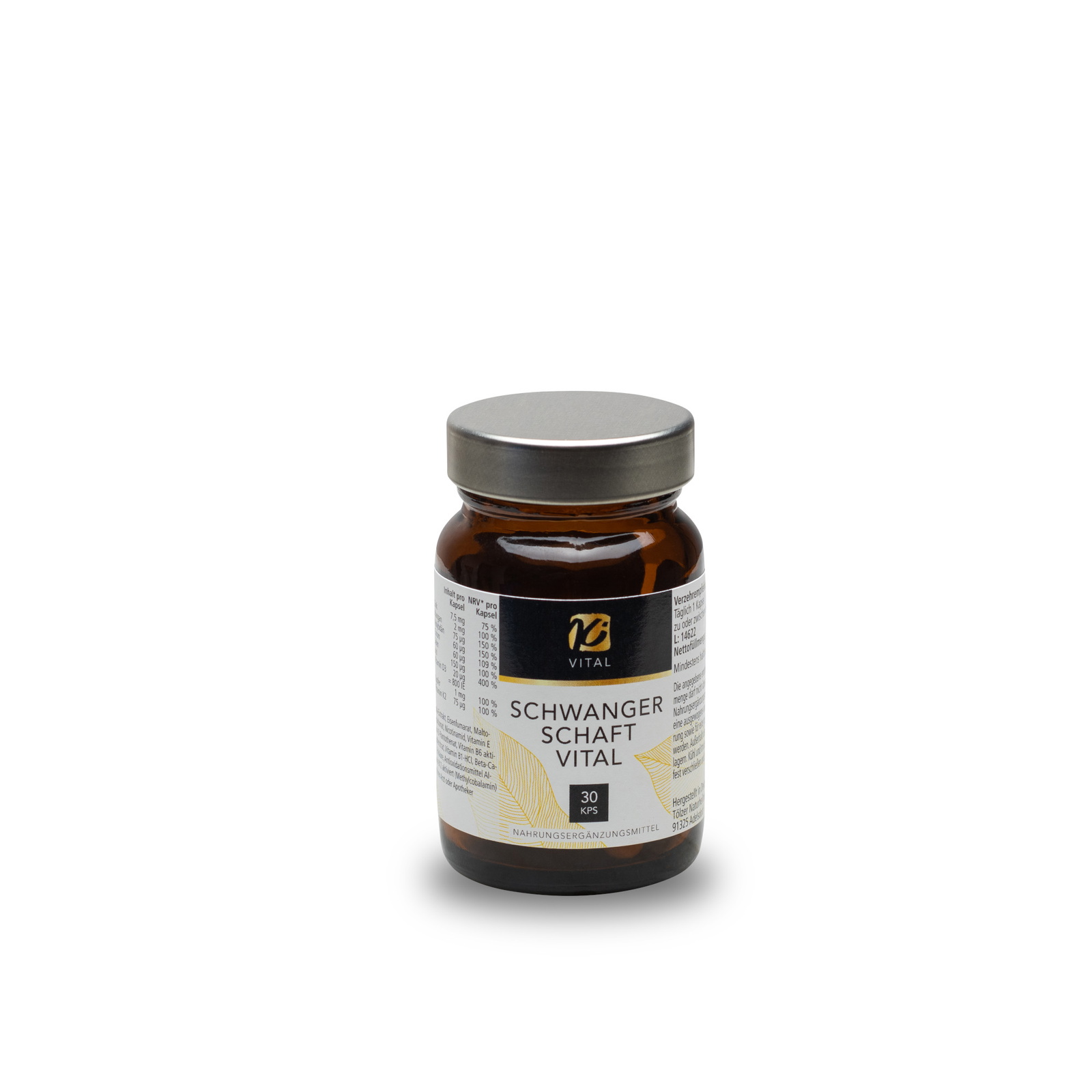 Inhaltsstoffe – Inhalt pro Kapsel: Vitamin C – 100 mg; Niacinamid – 20 mg; Vitamin E natürlich – 15 mg = 22,4 IE; Pantothensäure – 10 mg; Vitamin B6 akt. – 3 mg; Vitamin B2 akt. – 2 mg; Vitamin B1 – 2 mg; Folat gesamt – 800 µg (aus Folsäure – 400 µg, Folsäure aktiviert – 400 µg); Biotin – 150 µg; Vitamin B12 aktiviert – 5 µg; Beta-Carotin – 2 mg (enthält Vitamin A – 333 µg RE); Eisen – 14 mg; Zink – 7,5 mg; Mangan – 2 mg; Molybdän – 75 µg; Chrom – 60 µg; Selen – 60 µg; Jod – 150 µg; Vitamin D3 – 20 µg = 800 IE; Kupfer – 1 mg; Vitamin K2 – 75 µg