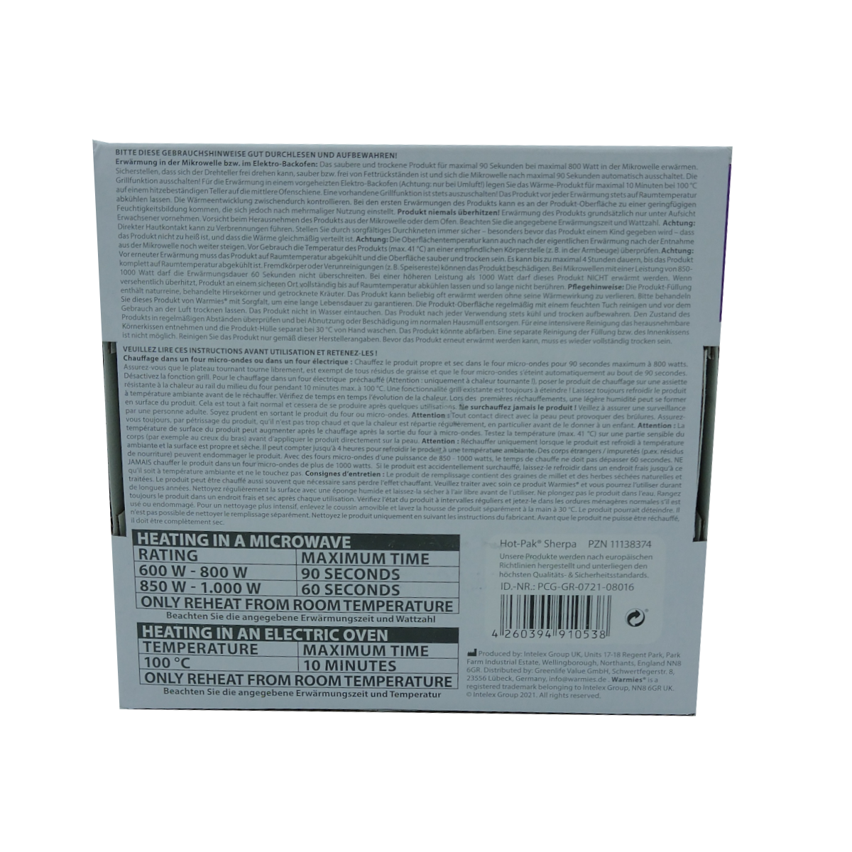 Bitte entfernen Sie das Papier-Etikett und erwärmen das nicht verschmutzte und trockene Produkt für maximal 90 Sekunden bei maximal 800 Watt in der Mikrowelle.